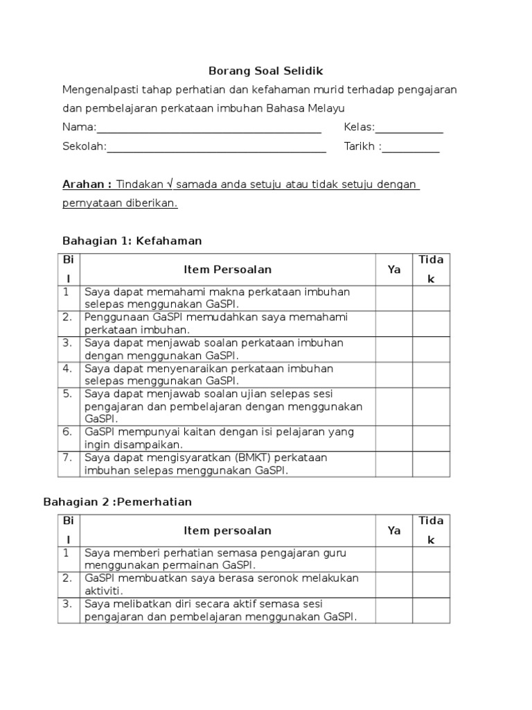 Contoh Soal Selidik Bahasa Melayu By Ise_874Annalise 31 May, 2022 Post a Comment Contoh Borang Soal Selidik Pdf Borang Soal Selidik Pdf Borang Soal Selidik Pdf Soal Selidik Guru Mata Pelajaran Bahasa Melayu Pemahaman Pdf Kata Majmuk 2 For Primary 2 3 Malay Language Photosynthesis Worksheet Preschool Activity Share No comments for "Contoh Soal Selidik Bahasa Melayu"